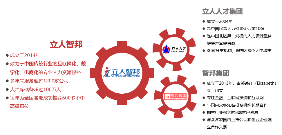 立人智邦成立于2014年,是由立人人才集團(tuán)與智邦人力集團(tuán)強強聯(lián)手共同組建,這兩家公司在業(yè)內(nèi)都具有十余年獵頭經(jīng)驗的著名獵頭公司。立人人才集團(tuán)成立于2004年,是中國民營人力資源企業(yè)前10強,也是中國北區(qū)第一規(guī)模的人力資源整體解決方案提供商。立人人才集團(tuán)擁有30家分支機構(gòu),遍布200個大中城市。立人人才集團(tuán)組織架構(gòu)為事業(yè)部制,外包事業(yè)部、獵頭事業(yè)部(立人智邦)、管理咨詢事業(yè)部、互聯(lián)網(wǎng)+事業(yè)部。智邦集團(tuán)成立于2013年,由郭蓬紅(Elizabeth)女士創(chuàng)立,在創(chuàng)業(yè)初期以專注互聯(lián)網(wǎng)投資和互聯(lián)網(wǎng)被投企業(yè)提供人才服務(wù)為主線,同時 探索二三級城市傳統(tǒng)行業(yè)為輔線。智邦集團(tuán)與國內(nèi)眾多知名投資機構(gòu)長期合作,擁有行業(yè)強大的B端客戶資源。目前已與眾多家國內(nèi)上市公司和創(chuàng)業(yè) 企業(yè)建立合作關(guān)系,并成就了優(yōu)秀人才的職業(yè)發(fā)展。
